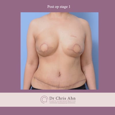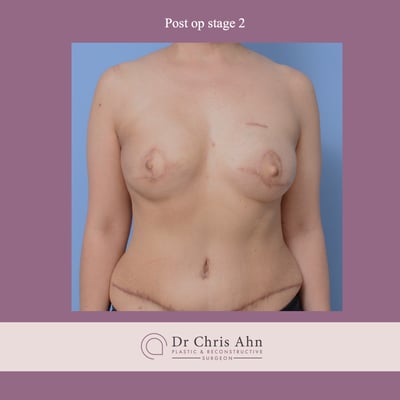 At the 6 month mark, this patient will undergo the second stage of her breast reconstruction journey, where the skin patches from her abdomen that are no longer required for monitoring will be excised through a simple day procedure to convert the elliptical scar to a linear one.