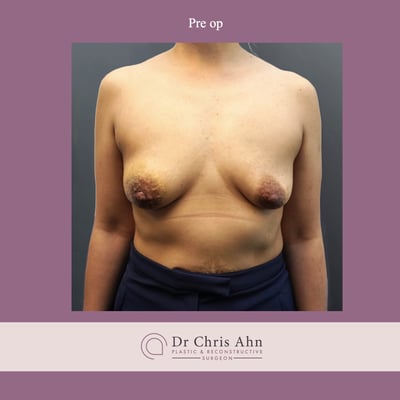 This patient had pre-existing asymmetry and required bilateral nipple and skin sparing mastectomy for breast cancer.