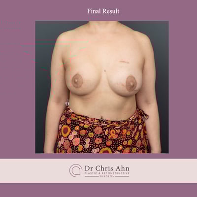 This patient in her 30s was diagnosed with left breast cancer and after having an initial lumpectomy with chemotherapy, decided to proceed to having a completion left mastectomy and right prophylactic mastectomy.