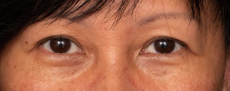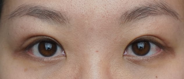 This patient in her 30s had a pre-existing but weak natural fold on her left eye and no fold on her right eye. Both eyes are affected by moderate skin excess while her right eye has ptosis caused by a weak activation her her levator muscle - the muscle which allows opening of the eyelid.