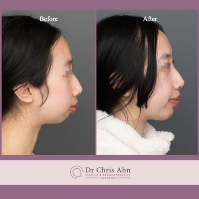 Uses an external approach with an incision made under the chin in the neck area. Dissection is performed superiorly to expose the jaw line and a pre-selected implant is inserted and secured to the bone using screws. There are a number of different implant materials available however Dr Ahn prefers to use a porous polyethylene implant that avoids bony erosion and enable secure fixation of the implant to bone using screws.